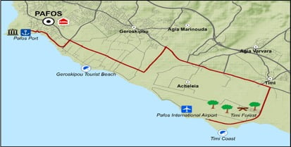 טיול זה הוא למעשה סיור אופניים באזור Pafos . המסלול עובר לאורך חזית החוף של Kato Pafos, חולף על פני החוף הציבורי של Geroskipou ומסתיים בחוף Timi הסמוך לשדה התעופה של Pafos וחורשת האקליפטוסים הסמוכה.