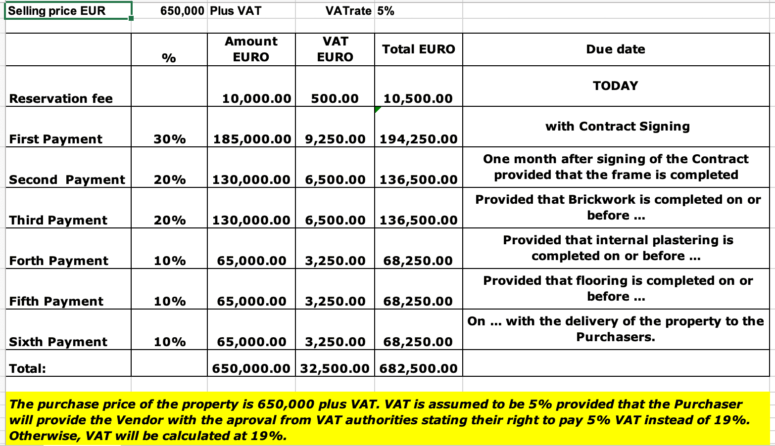 התשלום בעת חתימת החוזה נע בין 30%-40% מערך הנכס (+ מע״מ). לאחר תשלום זה יוחתם החוזה ויופקד ברשת המיסים וה Land Registry שזו המקבילה הקפריסאית להערת האזהרה המוכרת לכם מישראל. המשך התשלומים יהייה אך ורק בהתאם לשלבי הבנייה. אנחנו יודעים שיש קבלנים שמבקשים ומקבלים חוזה עם תשלומים תקופתיים קבועים. זה לא רעיון טוב עבורכם.