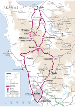 המסלול שוכן ממזרח ל Paphos ונמצא באזור הררי עם גבהים גבוהים יחסית. המדרונות התלולים מכוסים יער וכרמים. הסביבה יוצרת בתי גידול למספר רב של פלורה המאופיינת בעצי האלון, יערות האורנים נמצאים בעיקר בצפון מזרח. באזור ישנם סוגים רבים של יונקים, דו-חיים, זוחלים וציפורים. לאורך מסלול זה ניתן לבקר בשבעה יקבים הפתוחים למבקרים.