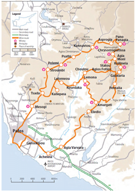 באזור זה, חובבי היין יכולים לבקר בארבעה יקבים מתוך כ – 20 יקבים קיימים ולטעום את היינות המגוונים והמיוחדים לאזור זה, בשילוב עם טעימות של אוכל קפריסאי משובח. לאורך המסלול ניתן למצוא טברנות רבות שניתן ליהנות מהן.